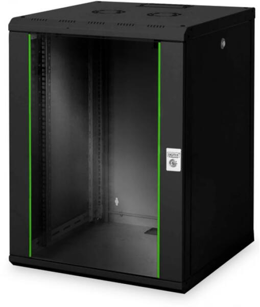 16U fali szekrény, Egyedi 820x600x600 mm, fekete szín (RAL 9005). - IP20 biztonsági osztály - Zárható biztonsági üvegajtó acél kerettel - 210°-os ajtónyitási szög - 1 pontos zárszerkezet a bejárat...