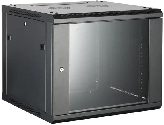 19" fali kivitel (6U, 600x600x370, fekete, egyrekeszes, üvegajtós, max. 60 kg).