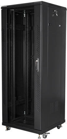 The cabinet allows full adjustment of the depth of vertical mounting rails. It is equipped with a front door made of tempered glass with a lock, with the possibility of fitting the right or left side. It has removable side panels (with locks included) and a rear solid steel door with a lock. It is possible to insert the wiring through the closed top and bottom panels (with end caps included).