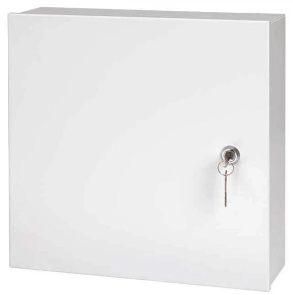 Univerzális, zárható szekrény, felületre szerelhető. - Méret 300x300x140 mm - Anyaga 0,8 mm-es acél, porfestett fehér bevonattal - Hátlap és szerelőlap nélkül