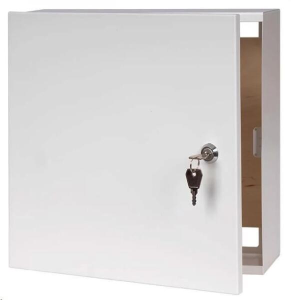 Univerzális, zárható szekrény, felületre szerelhető. - Méret 300x300x100 mm - Anyaga 0,8 mm-es acél, porfestett fehér bevonattal - Beépített szerelőlap rétegelt lemez 290 x 230 x 8 mm