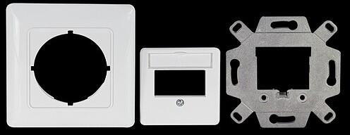 Fali konnektor 2db Keystone modulhoz, dizájnkompatibilis Egyenes konnektor, USB, HDMI, FO vagy RJ45 számára Teljes készlet: Külső és központi lemez, szerelőkeret 50x50 mm-es központi lemez porvédővel 80x80 mm külső keret UAE fém szerelőkeret Szín: hasonló RAL 9003-ig jelzőfehér Alkalmas süllyesztett, falra szerelhető és csatornás kivitelre