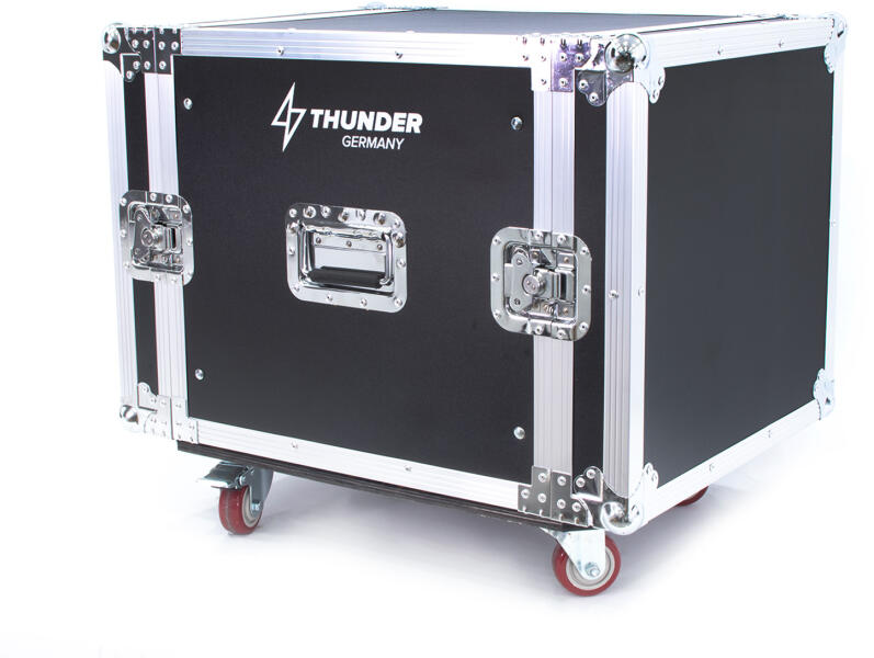 A Thunder rack-ek abszolút a felső kategóriát képviselik. Számos méretben és kialakításban elérhetőek. A rack anyaga fa rétegelt lemez, fekete kopásálló festéssel, alumínium élekkel, masszív acél sarokvédőkkel. Precíz illesztések jellemzik. Masszív kialakításának köszönhetően nagyobb tömegű eszközök, nehezebb végfokok szállítása sem jelent problémát. Praktikus hordfüleinek köszönhetően jól szállítható. Az eszközök csavarral rögzíthetőek bele, így stabilan megállnak a dobozban. Elő illetve hátlapja pillanatok alatt le- és felszerelhető pillangózárai segítségével. Minden felhasználónak érdemes beszerezni Racket eszközei szállításához, igényes, kulturált megoldás, amivel megóvhatjuk eszközeink külső állapotát is. Aki Rack vásárlást tervez, mindenképp érdemes a Thunder rackekkel számolni.